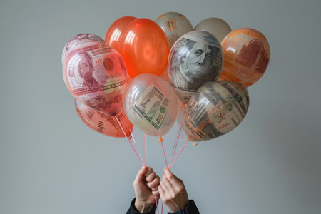 A person holds a bunch of balloons with money attached to them, Person trying to hold onto a bunch of inflated balloons, each depicting world currencies, AI Generated
