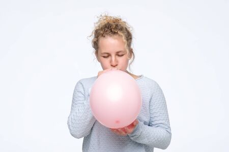 woman in gblue sweateris blowing pink balloon preparing for birthday party