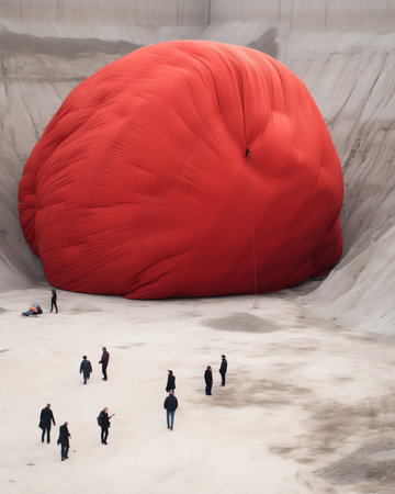 Generative AI : Aerial view of people working in a field stretching red cotton fabric rolls in Narsingdi Dhaka Bangladesh