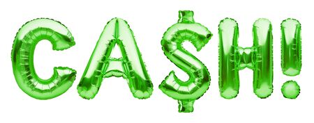 Green word CASH made of inflatable balloons isolated on white. Foil balloon letters. Accounting, banking, money, salary, budget and economy concept