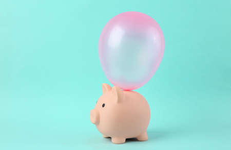 Piggy bank with Pink balloon on bright blue background
