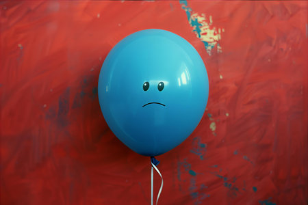 Blue balloon with sad face on a red background. 3d rendering