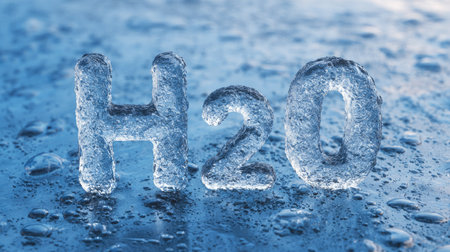 The image features the chemical formula H2O formed from clear ice letters resting on a water surface. The composition showcases a close-up perspective with cool blue tones, highlighting the texture of the ice and the surrounding droplets. The visual could be used for scientific presentations or educational material.