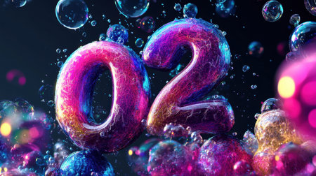 Bold 02 rendered in 3D, encased in vibrant bubbles on a gradient dark backdrop, perfect for creative designs.