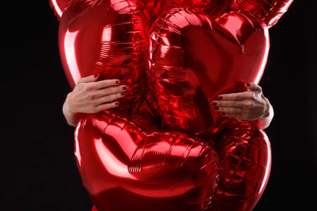 Hands embrace a bunch of air red balloons in the form of hearts close-up on a black background