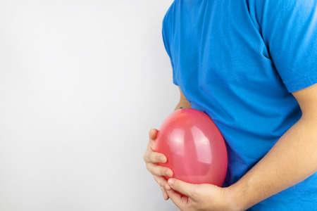 Conceptual photography. The man holds a red ball near his belly, which symbolizes bloating and flatulence. Then he brings a needle to it to burst the balloon and thus get rid of the problem.