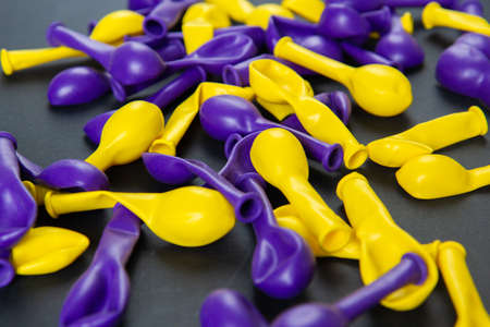Plastic yellow and purple balloons on a black background. Top view.