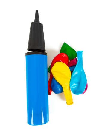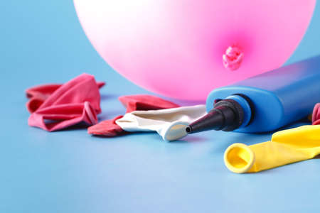 Air-pump inflating a pink ballon on a blue background