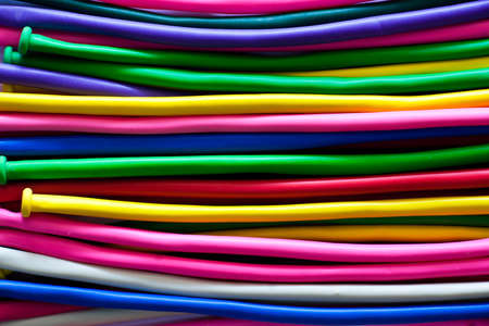 Multi-colored not inflated balloons red, yellow, blue, green lie diagonally on a blue background