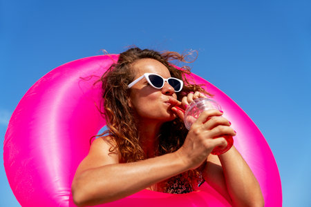 Joyful woman sipping drink and posing with colorful inflatable float against blue sky