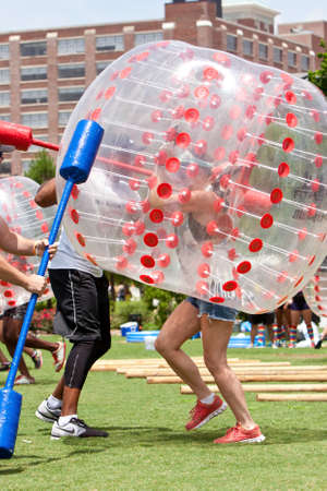 Atlanta, GA, USA - July 11, 2015: A woman wearing a plastic bubble gets hit while running the bubble gauntlet at Atlanta Field Day in the Old Fourth Ward Park in Atlanta.