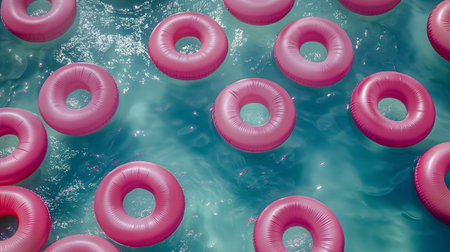 top view of a swimming pool and many pink inflatable lifebuoys floating on the surface of the water after a pink themed party