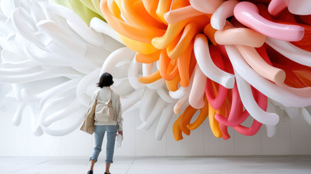 A woman with a backpack stands in awe, gazing up at a massive, intricate flower sculpture crafted from numerous inflated balloons in various bright colors.