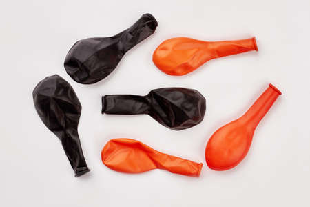 Red and black balloons without air. Group of new colorful balloons isolated on white background. Rubber objects for Halloween party decoration.