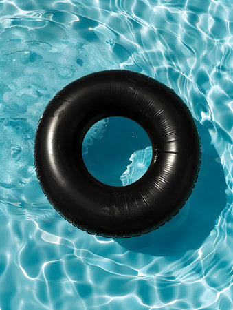 Top view of a black inflatable ring by the poolside. Colorful Summer Wallpapers