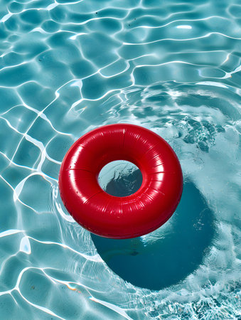 Top view of a red inflatable ring by the poolside. Colorful Summer Wallpapers