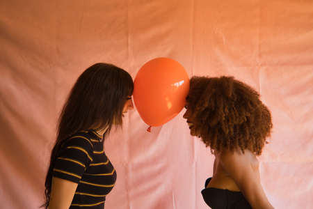 Young Hispanic and Latina women dancing with a balloon held by the forehead, on a pink background.