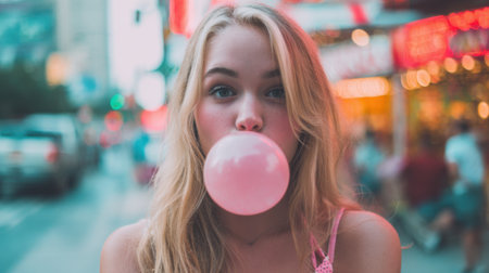 A young woman stands on a lively city street, blowing a large pink bubble with her gum. Bright lights from nearby shops illuminate the scene, creating a vibrant atmosphere.