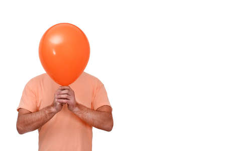 A man holds a balloon in front of his head. The balloon is like a mask.