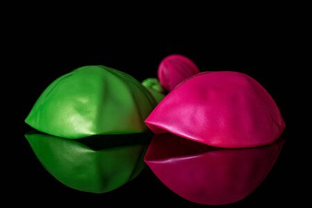 Group of two whole latex pastel ballon isolated on black glass