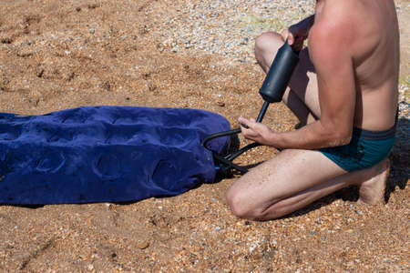 a man in swimming trunks pumps up a rubber mattress on the sand, on the seashore. Swimming on inflatable boats. Fun summer leisure