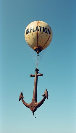 Inflation balloon is lifting a rusty anchor, symbolizing rising economy and financial struggles