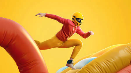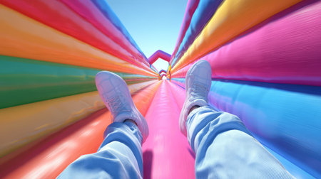 Point of View Shot of Person Sliding Down a Giant Colorful Inflatable Rainbow Tunnel Slide With Motion Blur Effect at an Outdoor Summer Amusement Park. Generative AI