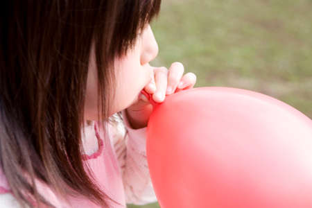 Japanese girl blowing up a balloon