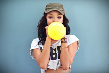 All good things are wild and free. Studio shot of a young woman inflating a balloon against a teal background.