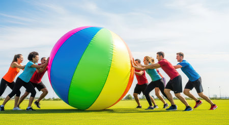 Group of young adults playing with giant colorful beach ball outdoors