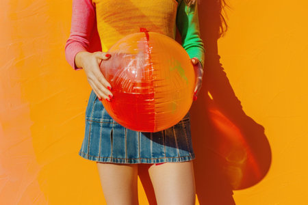 Vibrant woman holding orange beach ball in front of rainbow background against orange wall