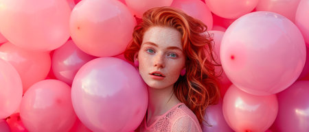 A young woman with a redhead holds a pink balloon