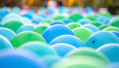 An abstract, shallow depth of field view of numerous blue and green balloons creating a textured, rounded pattern.