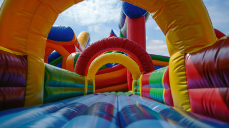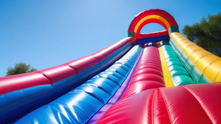 A vibrant and colorful inflatable play structure captured against a bright blue sky, perfect for outdoor entertainment and summer activities for children.