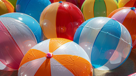 An array of inflatable beach balls in various sizes and colors each displaying their unique plastic textures under the bright sunlight