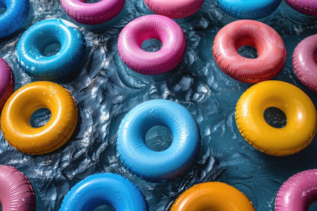 Vibrant inflatable swim rings gently bobbing on the surface of a sunlit swimming pool