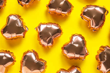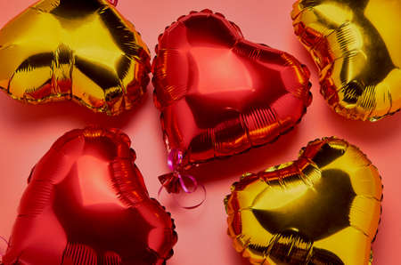 Air Balloons of heart shaped foil on pastel pink background. Love concept. Holiday celebration. Valentines Day or wedding,bachelorette party decoration. Red and golden metallic balloon. Flat lay.