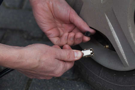 Checking tire pressure. Pumping air filling air into a car tire.