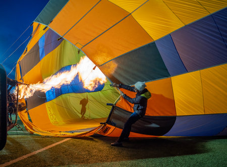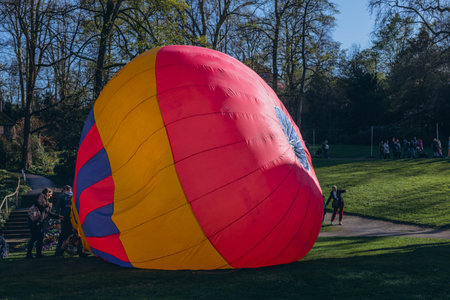 Ludwigsburg, Germany - March 23, 2024:A man inflates a balloon at a balloon festival