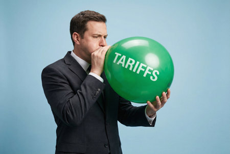 Businessman inflating green tariffs balloon, economic policy, trade war, inflation and market risk concept.