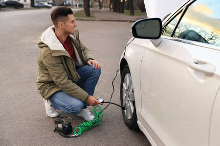 Handsome man inflating car tire with air compressor on street