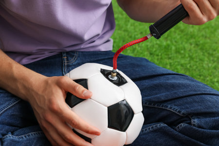 Person inflating soccer ball with manual air pump indoors, closeup