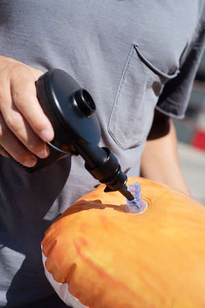 closeup of a young man, wearing a gray t-shirt, outdoors inflating a pool air matress with a hand held electric pump