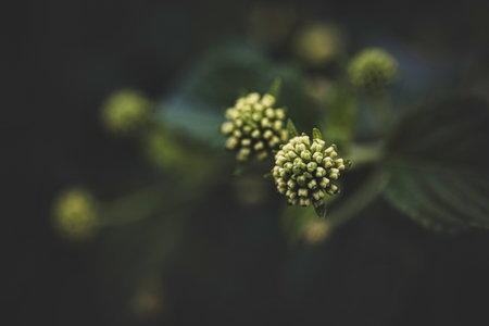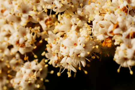 White inflorescence of on a branch of a plant called Viburnum lantana Aureum close-up.