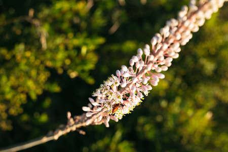 Close up of blooming white crape myrtle flower and buds. Branches of a flowering white bush of hydrangea close-up on a blurred background. toned.