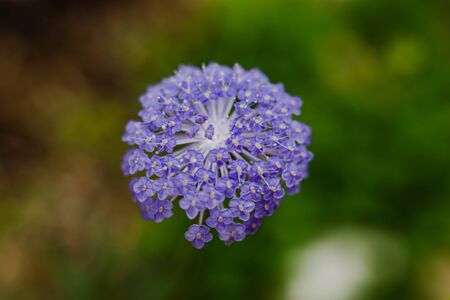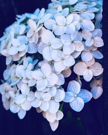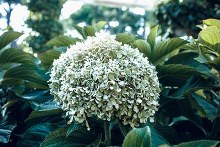 Gently blue hydrangea in bloom grows on shrub in botanic garden. summer flowers. Beautiful floral background for greeting card in birthday, anniversary, wedding. Stems with spherical inflorescences.