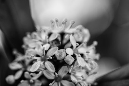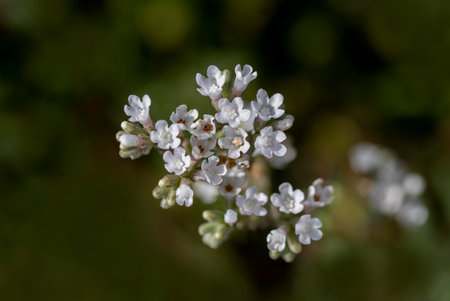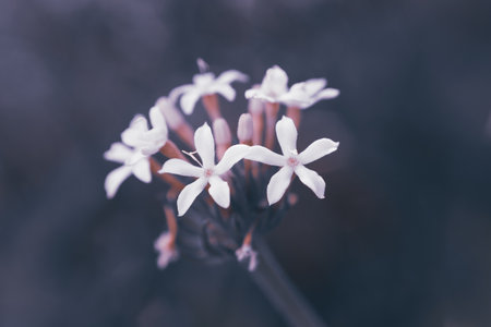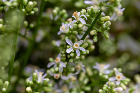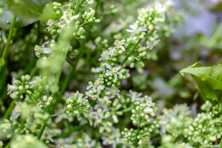 A close-up shot of a plant with small, white flowers isolated on a blurred background
