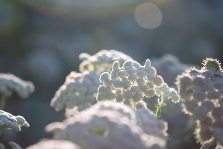 Hydrangea petiolaris. white flowers on a green background with highlights and bokeh. colorful plant photo. close-up. screensaver. wildlife photo. anomala. petiolaris.; Hydrangea.