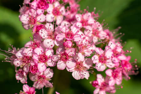 Pink flowering French tamarisk blossoms (Tamarix gallica) against green background, close up. Ornamental flower in the garden