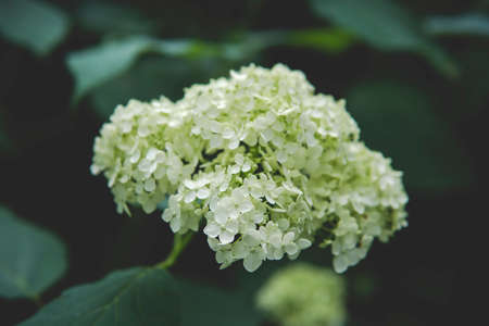 Beautiful white hydrangea or hortensia flower blossoms in summer garden in countryside. Nature summer background, Horizontal panorama banner